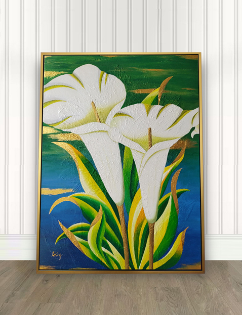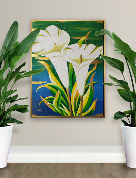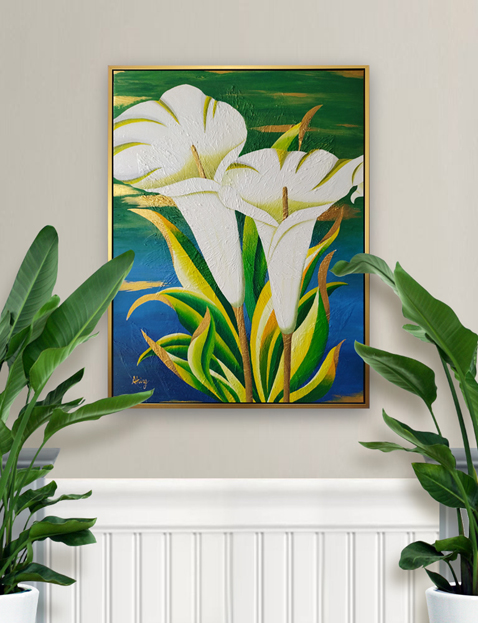 在這幅畫中,優雅的白色海芋,配上鮮活明亮的翠綠葉片,必定能吸引您的目光。另外高貴的金色點綴更增添了整幅畫作的優雅氣質。希望您會喜歡這幅畫。