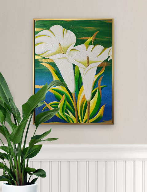 In this painting, the elegant white calla lilies with their lively, bright green leaves are sure to catch your eye, and the addition of noble golden accents further enhances the elegant appearance of the entire painting.